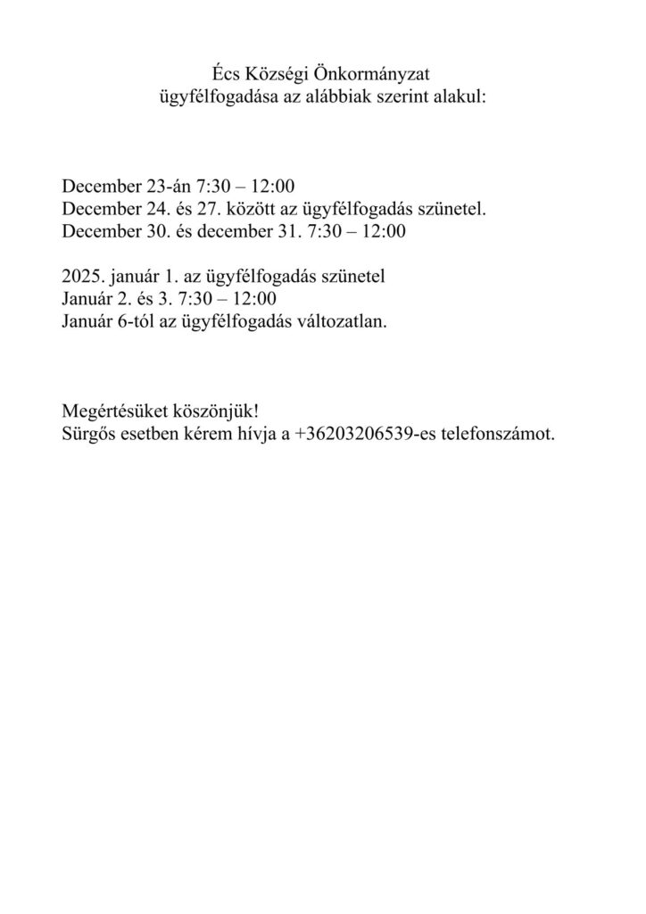 Ünnepi ügyfélfogadás az Önkormányzati Hivatalban